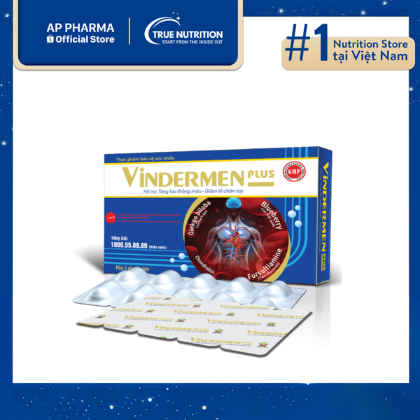 Vindermen Plus là sản phẩm dinh dưỡng đặc biệt được phát triển để hỗ trợ cải thiện lưu thông máu, giúp giảm hiệu quả nhiều triệu chứng liên quan đến tuần hoàn kém, bao gồm tê chân tay, đau đầu, chóng mặt, ù tai và khó ngủ. Sản phẩm này nổi bật với sự kết hợp của các thành phần vượt trội, bao gồm Fursultiamine, Ginkgo Biloba, Cao Blueberry và Chondroitin.