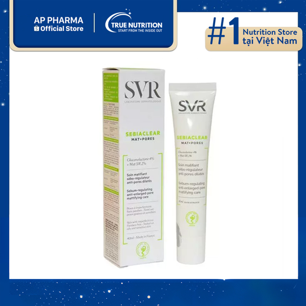 Kem dưỡng SVR Sebiaclear Mat + Pores là sản phẩm chăm sóc da chuyên sâu từ thương hiệu nổi tiếng SVR, Pháp, được thiết kế đặc biệt cho làn da dầu và dễ nổi mụn. Sản phẩm này giúp kiểm soát bã nhờn hiệu quả, giảm bóng dầu và thu nhỏ lỗ chân lông nhờ vào phức hợp Mat SR độc quyền. Thành phần Gluconolactone (AHA) kết hợp với Acid Salicylic (BHA) giúp làm sạch sâu lỗ chân lông, loại bỏ tế bào chết và ngăn ngừa mụn mới hình thành, đồng thời giảm sưng viêm cho làn da đang gặp vấn đề.