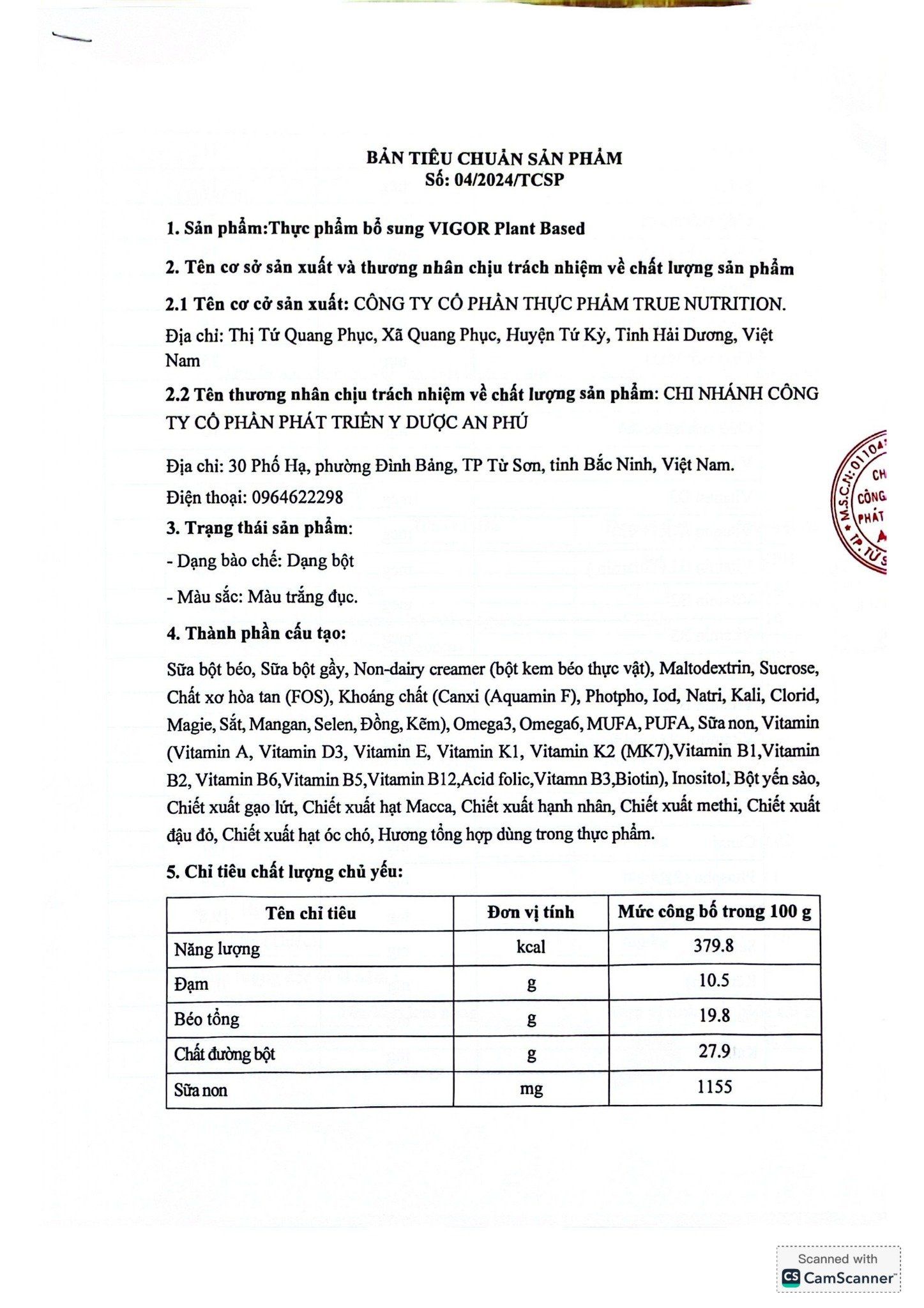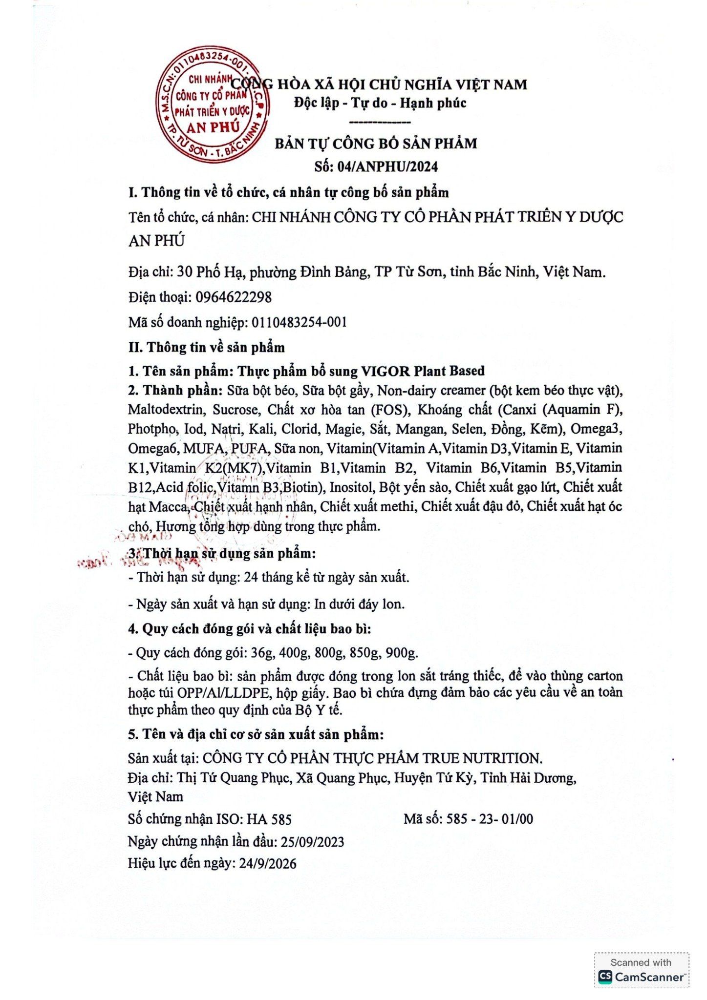 Thông tin tài liệu Tự Công Bố Sản Phẩm Vigor Plant Based: tại đây